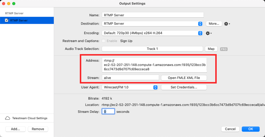 - Address には、Live モジュールで提供された Stream URL を入力します。