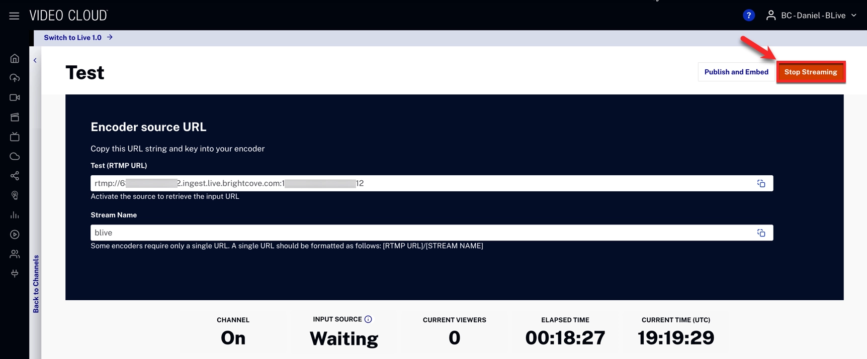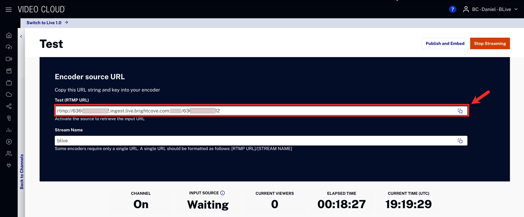 - をクリックして入力用URLを取得します。チャンネルが開始され、URLが生成されます(1分以上かかる場合があります)。