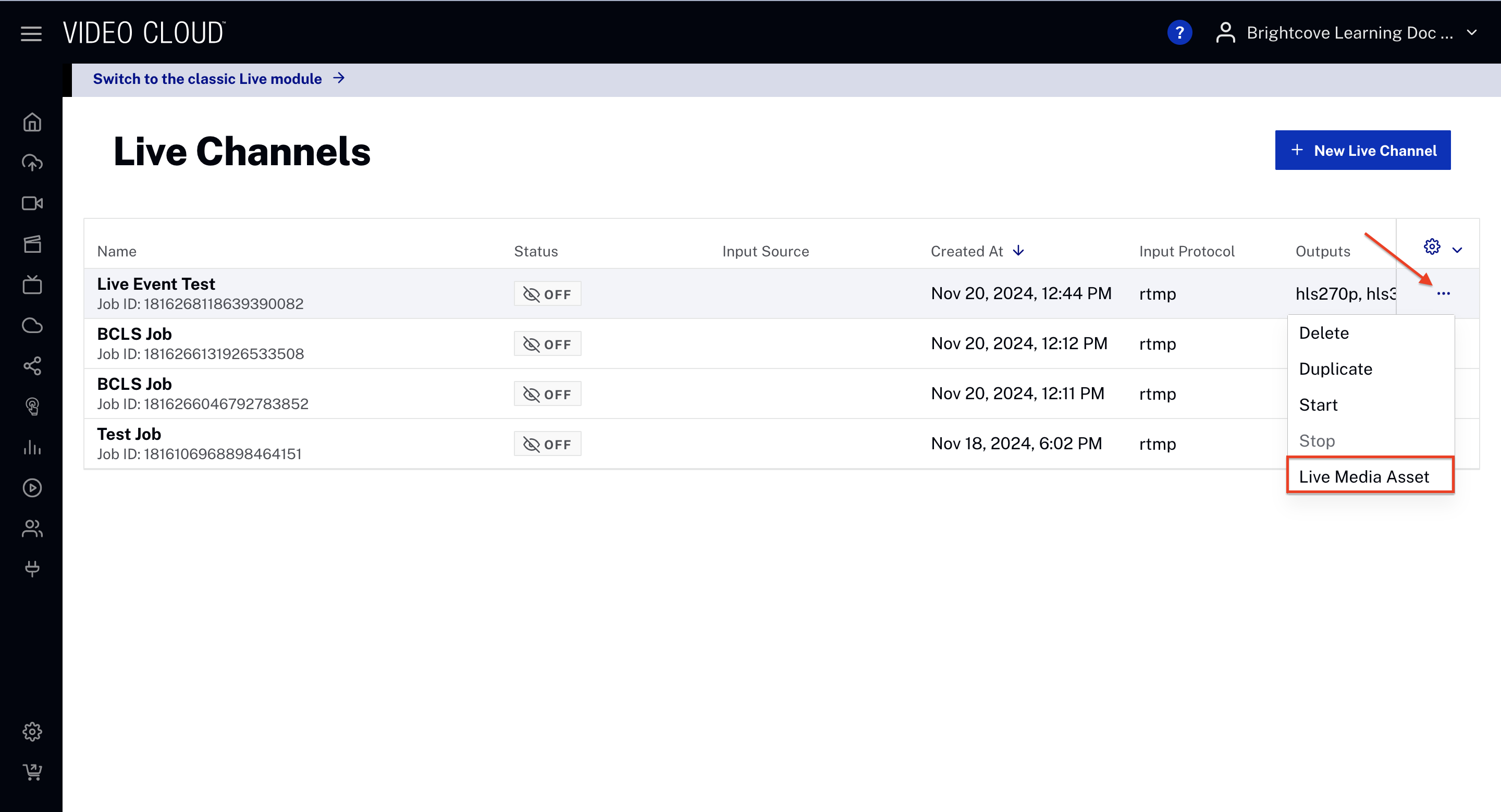 - ドロップダウンから ライブ メディア アセット をクリックします。