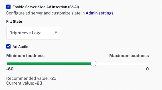 - 広告音声 設定にチェックを入れると、広告の音量が指定された調整に基づいて正規化されます。これにより、広告がコンテンツよりも著しく大きな音量にならないようにすることができます。Brightcove ではこのオプションを選択することを推奨しています。