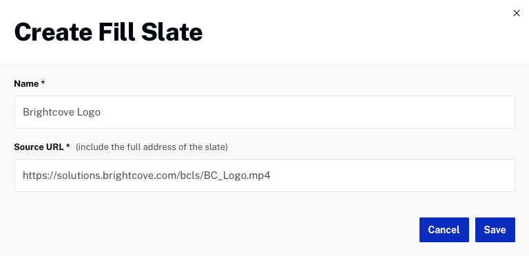 フィルスレートとは、ライブストリームの広告ブレーク中に、動的に提供される広告で埋めきれない時間に表示される動画です。リクエストされた広告が広告ブレーク時間より短い場合、プレーヤーが空白にならないようにフィルスレートが表示されます。サーバーサイド広告をリクエストする前に、少なくとも1つのフィルスレートを構成しておくべきです。広告スレートは、管理者メニューの Live 設定の一部として構成されます。この例では、Brightcove のロゴが表示されるフィルスレートが定義されています。
