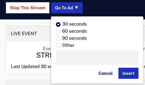 広告をリクエストするには、 をクリックします。クリックすると、広告ブレークの長さを選択できます。