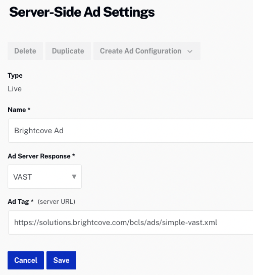 サーバーサイド広告を配信する前に、サーバーサイド広告の設定を構成する必要があります。サーバーサイド広告設定では、広告コール、タイミング、ビーコン、その他の広告設定オプションなど、広告再生のさまざまな側面を定義します。これらの設定は、管理者メニューのサーバーサイド広告設定の一部として構成されます。この例では、シンプルな広告タグが定義されています。