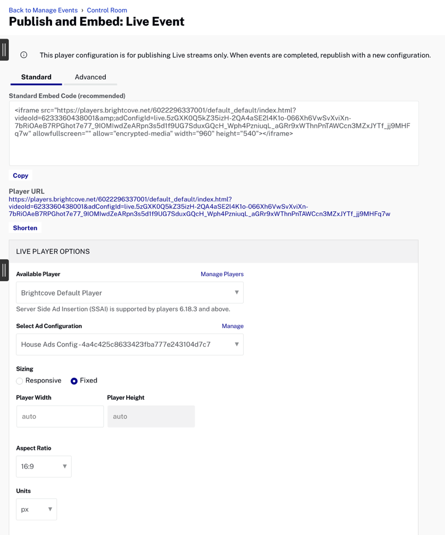 - プレーヤー URL をクリックして、ブラウザでイベントをプレビューするか、適切な埋め込みコードをコピーして使用します。