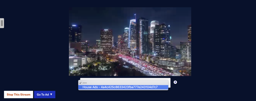 - デフォルトでは、調整室のプレビュー プレーヤーには広告なしのストリームが表示されます。広告は、Live 広告設定が選択されていない限り、調整室では表示されません。プレーヤーの下にあるドロップダウンから広告設定を選択してください。