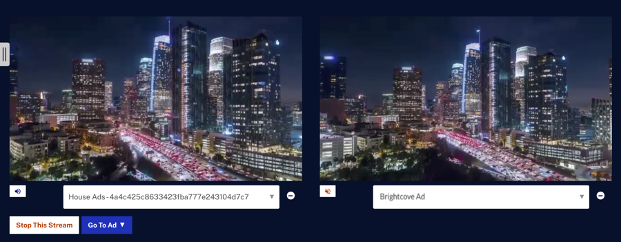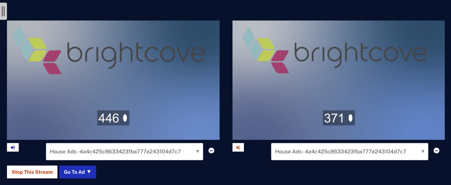 をクリックすると、ライブストリームに広告ブレークが挿入されます。広告が広告ブレーク時間をすべて埋められない場合は、(イベント作成時に選択した)フィルスレートが表示されます。広告は調整室のプレビュー プレーヤーや、Live モジュールを使用して公開されたプレーヤーに表示されます。この例では、調整室に2つの広告が表示されています。