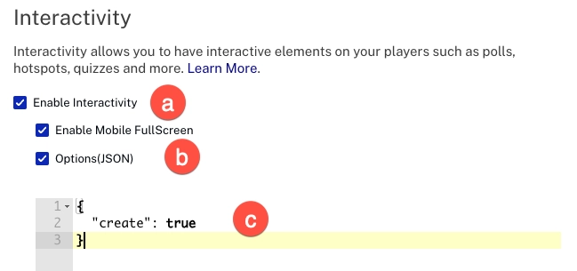- オプション (JSON) をチェックして、インタラクティブ プロジェクトの自動作成を有効にします。 JSON設定を挿入できるテキストエリアが表示されます。