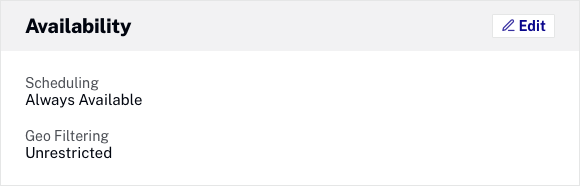 アベイラビリティ プロパティを編集するには、[編集]ボタンをクリックするか、そのセクションをダブルクリックします。動画アベイラビリティは、次の条件に基づいて設定できます。