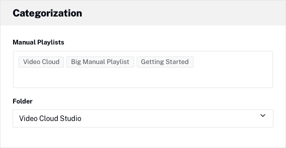 [分類] セクションでは、この動画が割り当てられている 手動プレイリスト と、動画が属している フォルダ が表示されます。プロパティを編集するには、このセクション内で直接変更を加えてください。変更後は Enter キーを押して保存します。