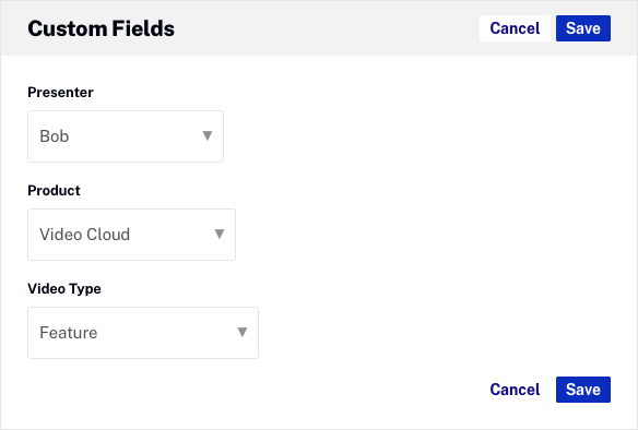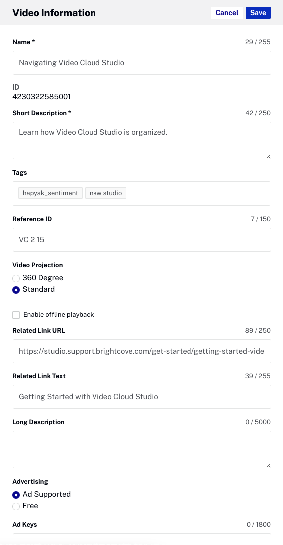 Video Cloud アカウントでは、メタデータの必須フィールドが設定されている場合があります。動画が非アクティブな場合は、すべての必須メタデータを入力しなくても自由に編集・保存が可能です。ただし、すべての必須メタデータが入力されるまで、動画をアクティブにすることはできません。また、すでにアクティブな動画では、編集中のセクション内ですべての必須メタデータを入力するか、動画を非アクティブにしない限り、変更を保存できません。必須フィールドの設定方法については、動画の必須フィールドを設定するをご覧ください。