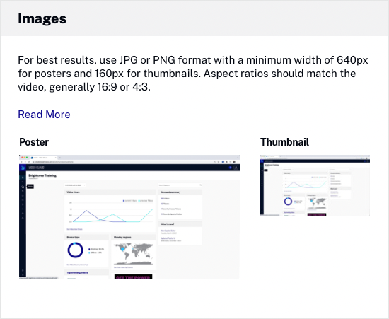 [画像]セクションでは、動画のポスター画像とサムネイル画像が表示されます。ポスター画像とサムネイル画像は、動画の中間地点から自動的にキャプチャされたスナップショットによって生成されます。自動生成された画像が気に入らない場合は、新しい画像をキャプチャするか、別の画像をアップロードして差し替えることができます。ポスター/サムネイル画像の上にマウスを乗せ、表示アイコン(