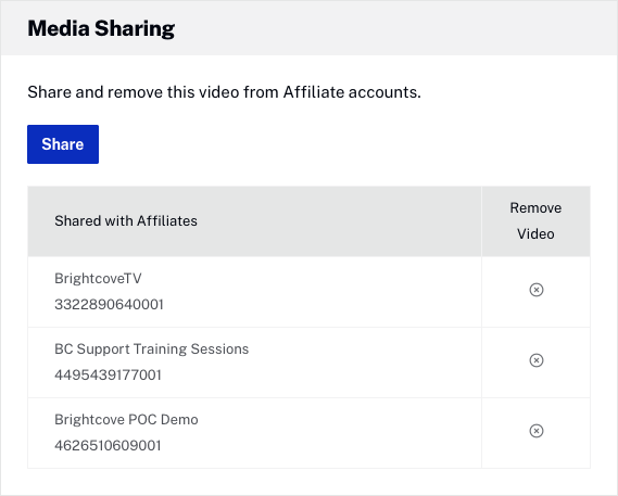 動画が関連アカウントに共有されている場合、[メディア共有] セクションが表示され、その動画が共有されているアフィリエイト アカウントの一覧が表示されます。メディア共有の詳細については、Media モジュールを使用したメディア共有 をご覧ください。