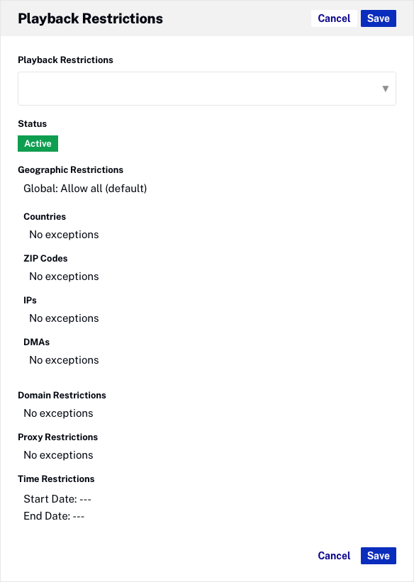 [再生制限]セクションには、設定されている再生制限が表示されます。再生制限の構成方法については、再生権の管理をご覧ください。