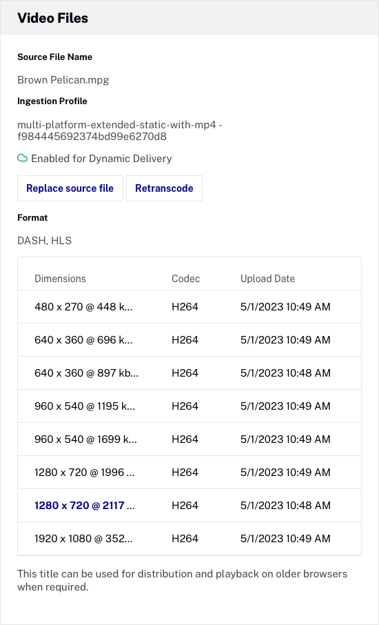 - 動画が取り込まれた際に使用されたトランスコードプロファイル(2022年11月16日以降にアップロードまたは再トランスコードされた動画の場合)