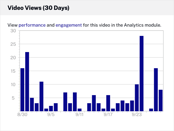 [解析]タブの下には、[動画視聴回数] セクションがあり、過去30日間の視聴回数が表示されます。詳細を見るには、リンクをクリックしてパフォーマンスまたはエンゲージメント レポートを表示します。