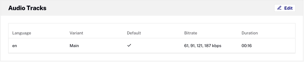 動画が Dynamic Delivery または Context Aware Encoding トランスコードプロファイルを使ってアップロード・トランスコードされた場合、[オーディオ トラック]セクションが表示され、利用可能な音声レンディションの情報が表示されます。追加のオーディオトラックの追加方法については、Media モジュールを使ったオーディオ トラックの追加をご覧ください。