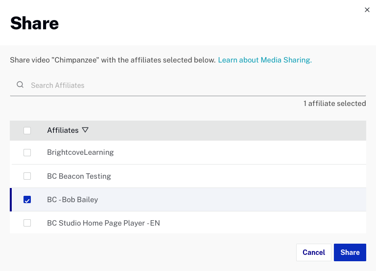 - 動画を共有するアフィリエイトアカウントを選択し、共有 をクリックします。検索フィールドを使用してアカウント ID を検索できます。この検索フィールドはあいまい検索に対応しているため、ID の一部を入力するだけで一致候補が表示されます。