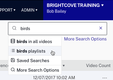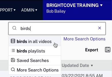 アカウント内の動画を検索するには、検索 フィールドに検索語を入力します。デフォルトでは、検索はビデオに対して実行されます。