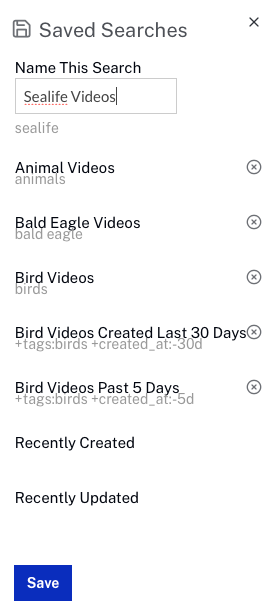 頻繁に実行する検索を保存しておけば、検索構文を再入力することなく、すばやく再実行できます。検索したいビデオを返す検索構文を入力したら、[検索の保存] をクリックします。保存した検索の名前を入力し、[保存] をクリックします。