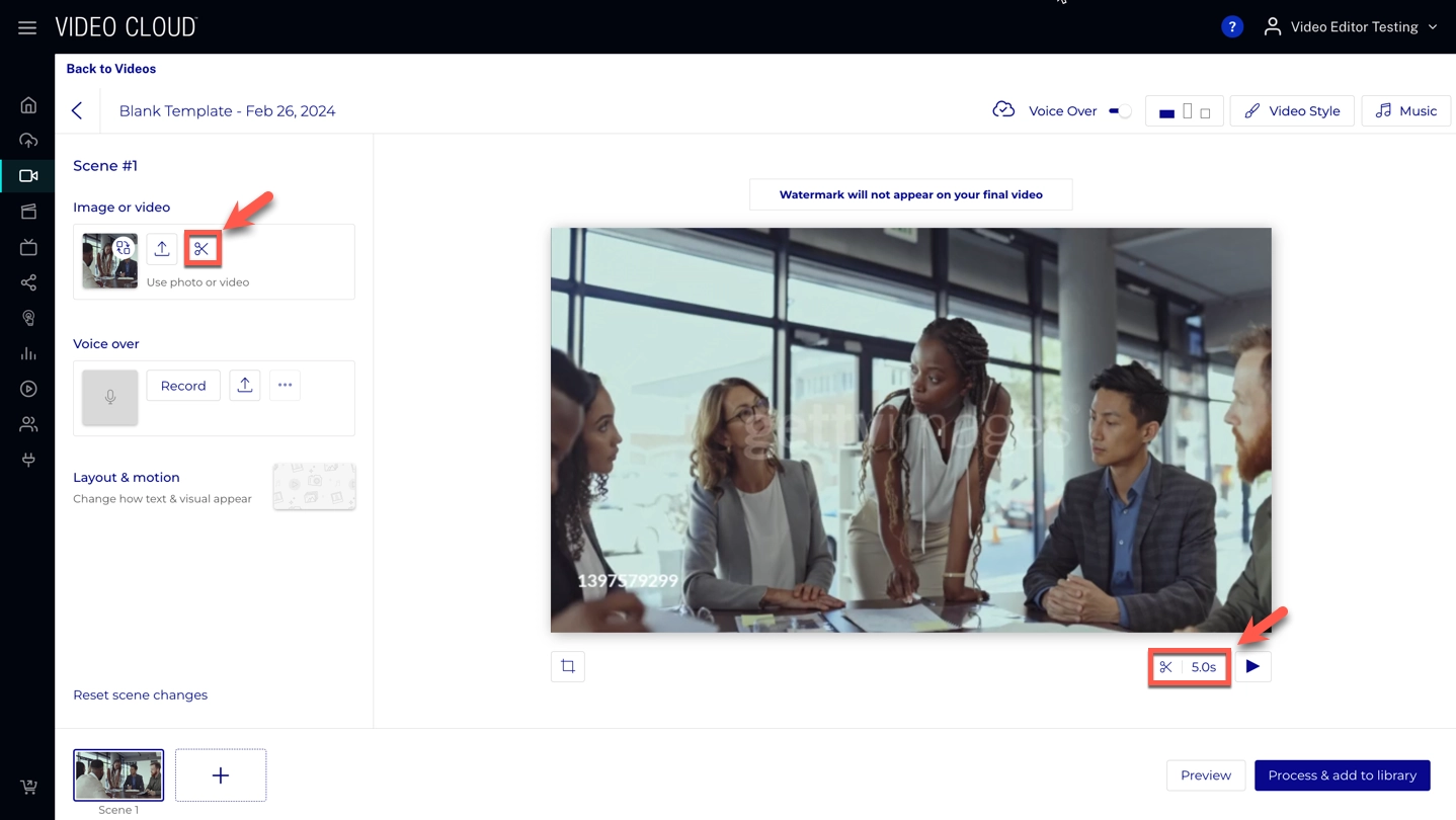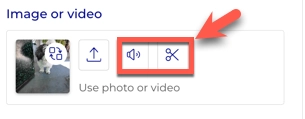 - 動画アセットをアップロードしたら、 アイコンをクリックして音声をミュートしたり、 アイコンをクリックして動画を 切り抜く ことができます。