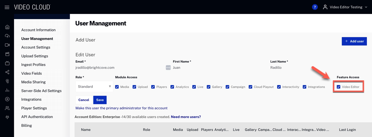 Brightcove ビデオ エディターは、デフォルトですべてのユーザーが利用できます。次のプロセスに従って、標準ユーザーを編集し、アクセス権を付与または削除できます。
