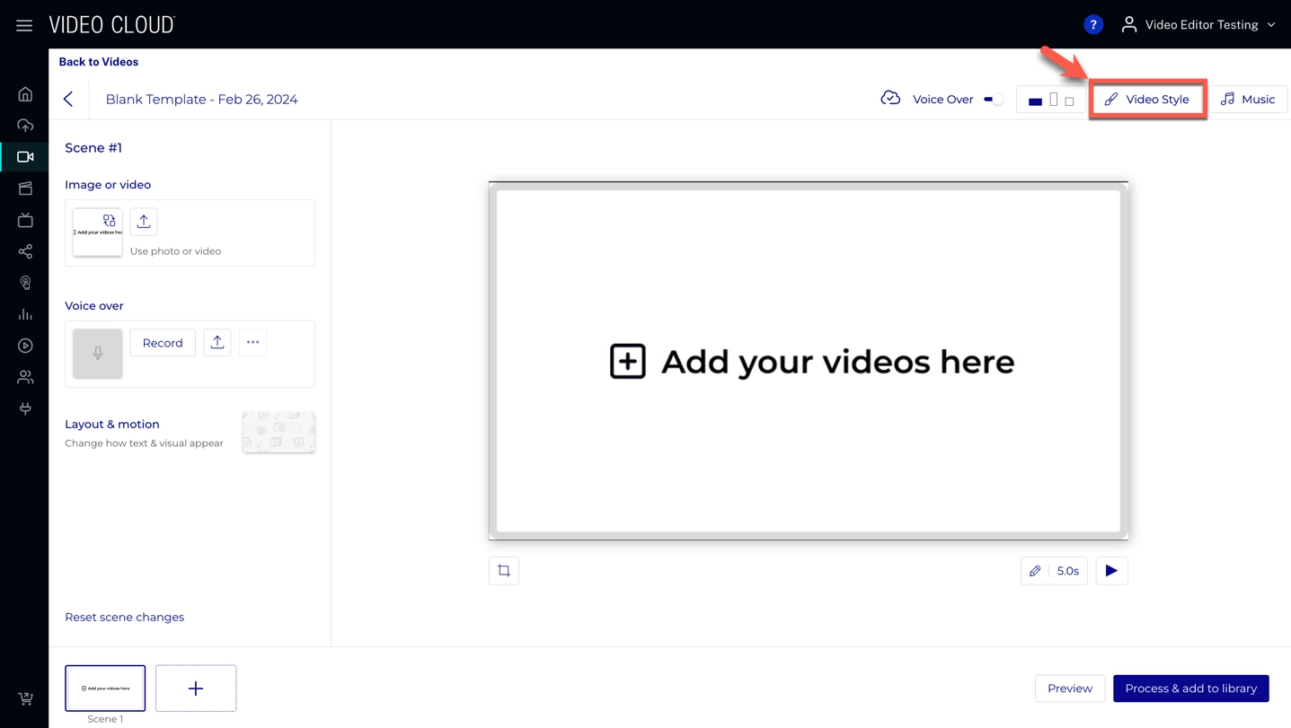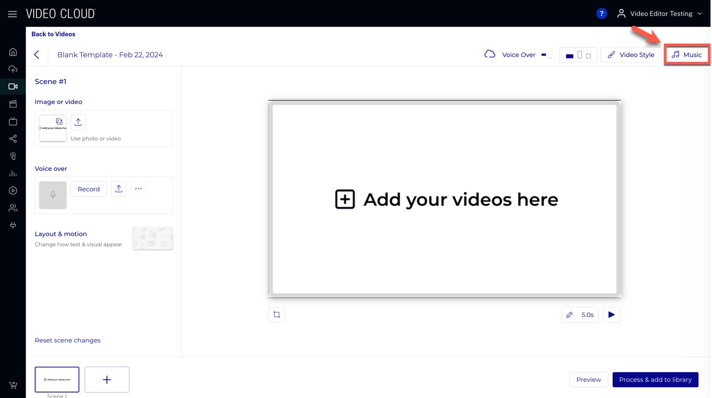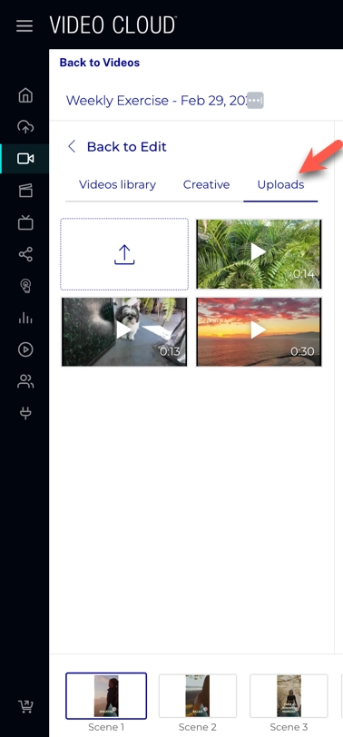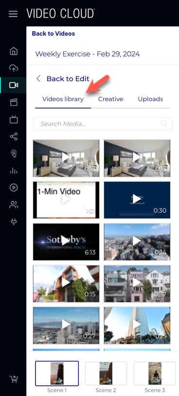 - Videos library タブでは、ビデオ ライブラリからアセットをアップロードできます。
