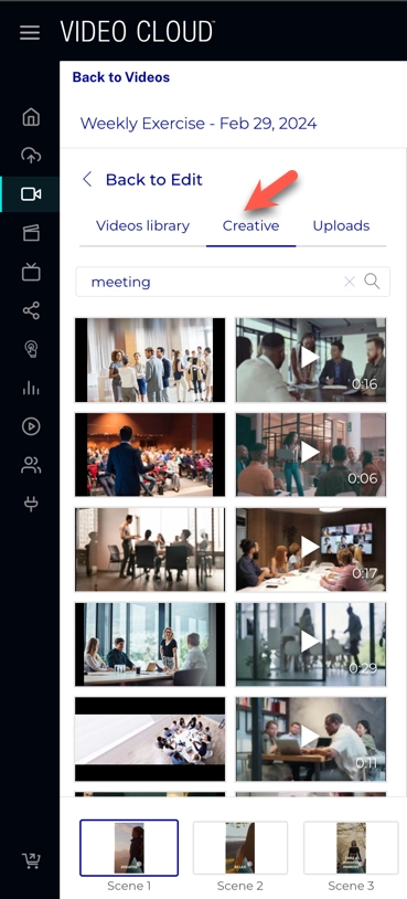 クリエイティブ タブでストック画像やビデオを検索するか、アップロード タブからファイルを送信します。