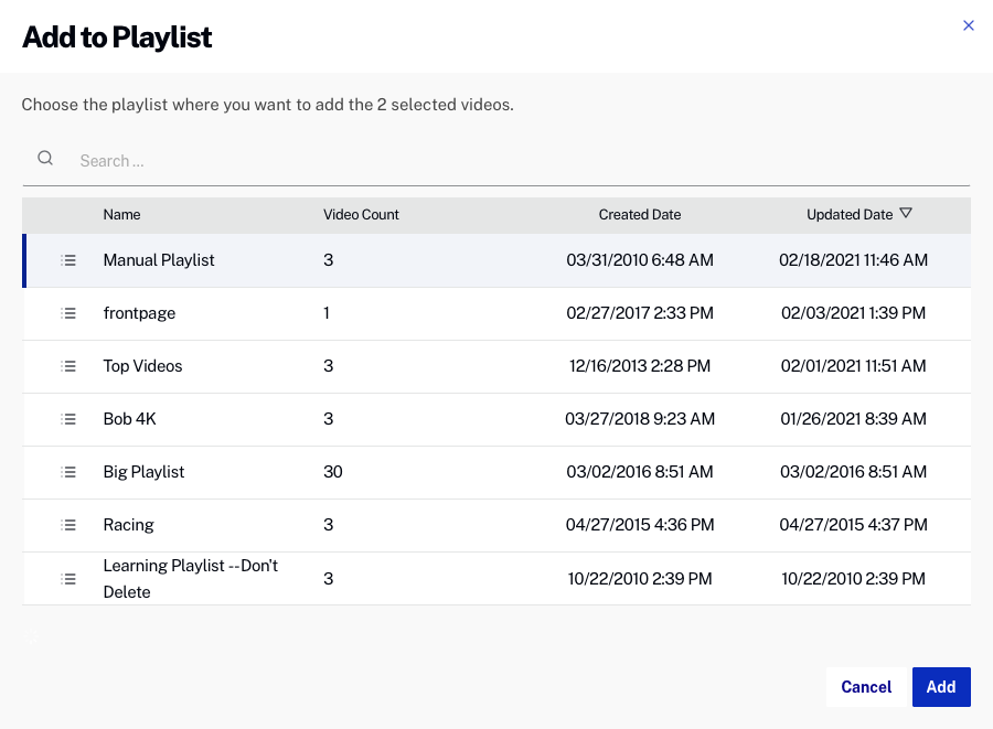 - をクリックします。手動プレイリストに追加された動画は、プレイリストの先頭に追加されます。