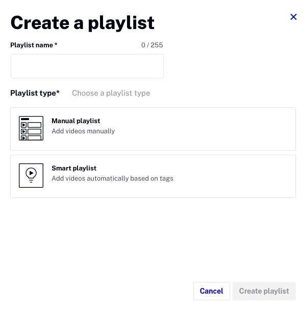 プレイリストには最大で 1,000 本の動画を追加できます(手動・スマートいずれも)。作成できるプレイリストの数に制限はありません。プレーヤーに最初に読み込まれる動画は、プレイリストの種類によって異なります: