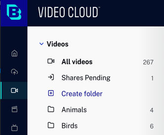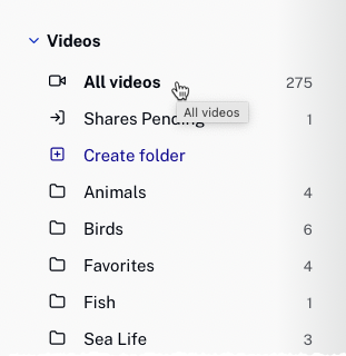 Media モジュール内でフォルダーを作成し、動画を整理することができます。動画をテーマ別、作成者別、製品別、地域別などで整理することが可能です。数百または数千の動画があるアカウントでは、フォルダーを使うことで管理がしやすくなります。フォルダーはサイドナビゲーションパネルに表示され、各フォルダー名の横には動画数が表示されます。サイドナビゲーションパネルを非表示/表示するには、サイドナビゲーションボタン