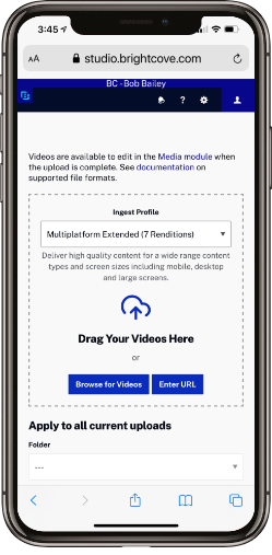 Media モジュールは完全にHTML5で書かれており、タブレットやモバイルデバイスでも使用できます。これにより、モバイルデバイスを使用してビデオを撮影し、Video Cloud アカウントにアップロードできます。モバイルデバイスからコンテンツをアップロードするには、アップロードモジュールを開き、取り込みプロファイルを選択します。[ ビデオの参照] をクリックすると、デバイス上の写真アプリケーションが開きます。アップロードする動画を選択し、[完了] をクリックします。モバイルデバイスからのビデオのアップロードが開始され、進行状況がデバイスに表示されます。