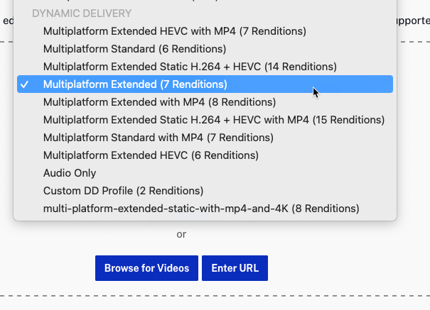 動画をアップロードする前に、取り込みプロファイルを選択します。取り込みプロファイルには、動画のトランスコード時に使用されるトランスコード設定が含まれています。使用可能な取り込みプロファイルのリストは、VideoCloudアカウントの構成方法によって異なります。次のスクリーンショットでは、両方コンテキストアウェアエンコーディングと動的配信プロファイルが利用可能です。