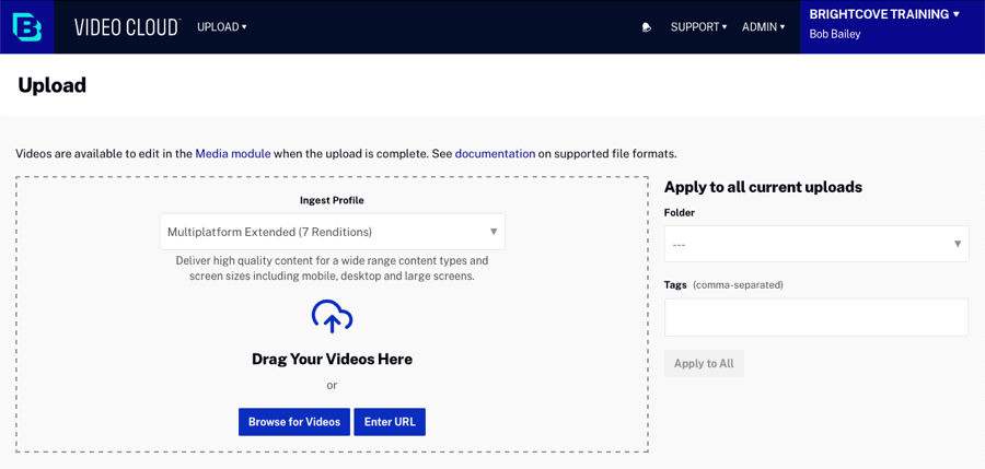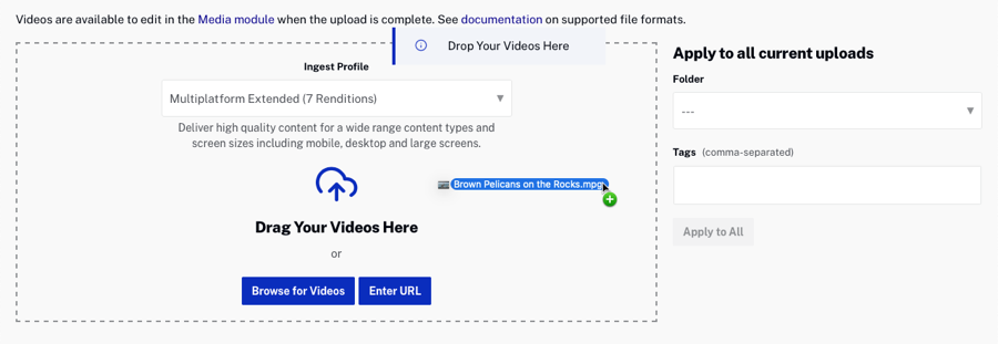 アップロードモジュールは、動的な取り込みプロセスを使用して動画コンテンツを取得およびトランスコードします。アップロードするファイルを選択すると、Video Cloud はプルベースのプロセスを使用してストレージロケーションからコンテンツをプルし、Zencoder トランスコーディングサービスを使用してコンテンツをトランスコードします。