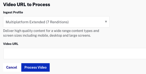 - リモート URL -[URL の入力] をクリックして、ソースファイルの場所を指定します。ソースファイルは、パブリック Dropbox フォルダまたは Amazon S3 ストレージの場所に保存できます。クリックビデオの処理終了時。