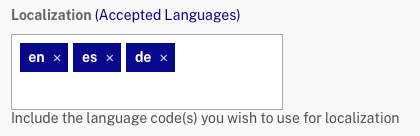 - ローカライズ フィールドに、対象の言語の 2文字の言語コードを入力し、Enter キーを押します。入力を進めると、言語リストが絞り込まれます。また、表示された値をクリックして選択することもできます。
