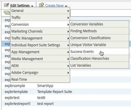 - 使用するレポートスイートを選択するか、新しいレポートスイートを作成します(管理 > レポートスイート)。