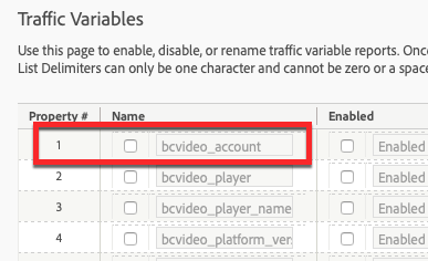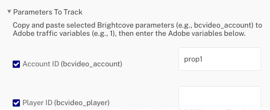 - 取得したい各パラメータについて、Adobe Analytics で設定したパラメータ番号を Brightcove の対応するパラメータフィールドに propX形式で入力します(X は Adobe Analytics の Property 番号に対応)。この例では、Brightcove のアカウントID を保持するために、Adobe Analytics で bcvideo-account トラフィック変数が作成され、Property #1 に割り当てられました。