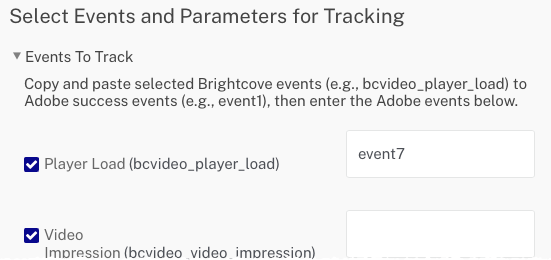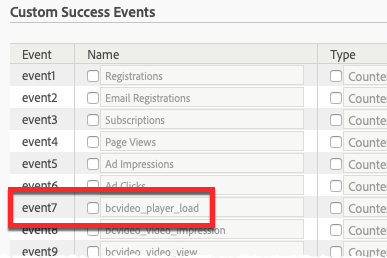 - トラッキングしたい各イベントについて、Adobe Analytics で作成されたイベント ID を Brightcove の対応するイベント フィールドに入力します。この例では、bcvideo_player_load イベントが Adobe Analytics でカスタム成功イベントとして作成され、event7 という ID が割り当てられました。
