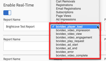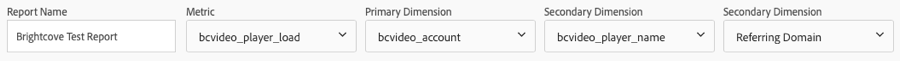 - メトリクス、一次ディメンション、二次ディメンション として、Adobe Analyticsで 成功イベント として設定した Brightcove イベントを選択します。イベントはリストに表示されるはずです。