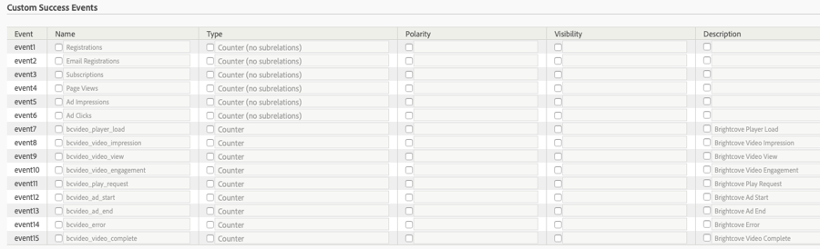 トラッキングするすべての Brightcove イベントは、Adobe Analytics でカスタム サクセス イベントとして作成する必要があります。Adobe 側で生成されたイベント ID は、Players モジュール内で使用されます。これにより、Brightcove のイベントデータを Adobe のサクセスイベントとして渡すことができます。以下のイベント リストを確認し、トラッキングするイベントを決定してください。