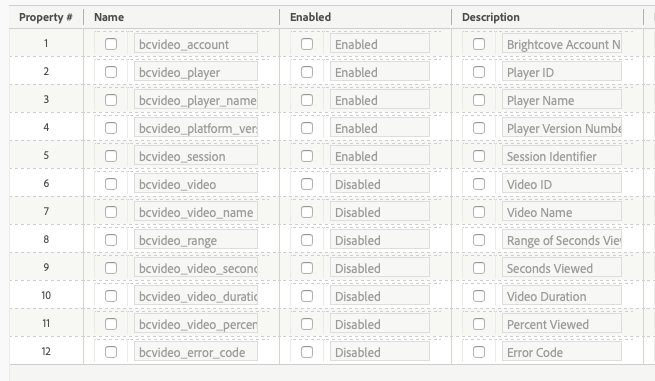 パラメータは追加データを持ち、イベントとともに送信されます。記録されるすべての Brightcove パラメータは、Adobe Analytics でトラフィック変数として作成する必要があります。指定されたパラメータ名は Players モジュール内で使用されます。これにより、Brightcove のパラメータを Adobe のトラフィック変数に渡すことが可能になります。以下のパラメータ一覧を確認し、どのパラメータを取得したいか検討してください。