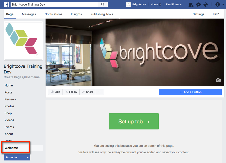 - [ 保存] をクリックします。Facebook の設定 UI には [ ようこそ]のタブ名が表示されますが、ページを表示すると新しい名前が表示されます。