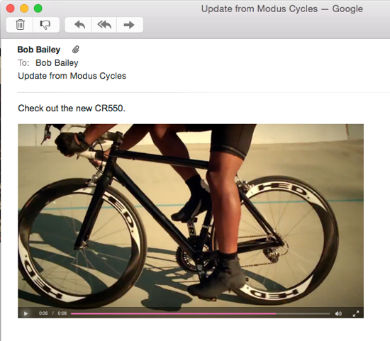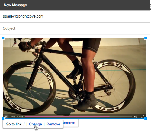 最後に、新しいメール メッセージを作成します。プレーヤー画像をメール本文に追加し、それを動画ランディングページへ遷移するクリック可能なリンクとして設定します。メールクライアントごとに操作方法は異なりますが、以下は Gmail での手順です。