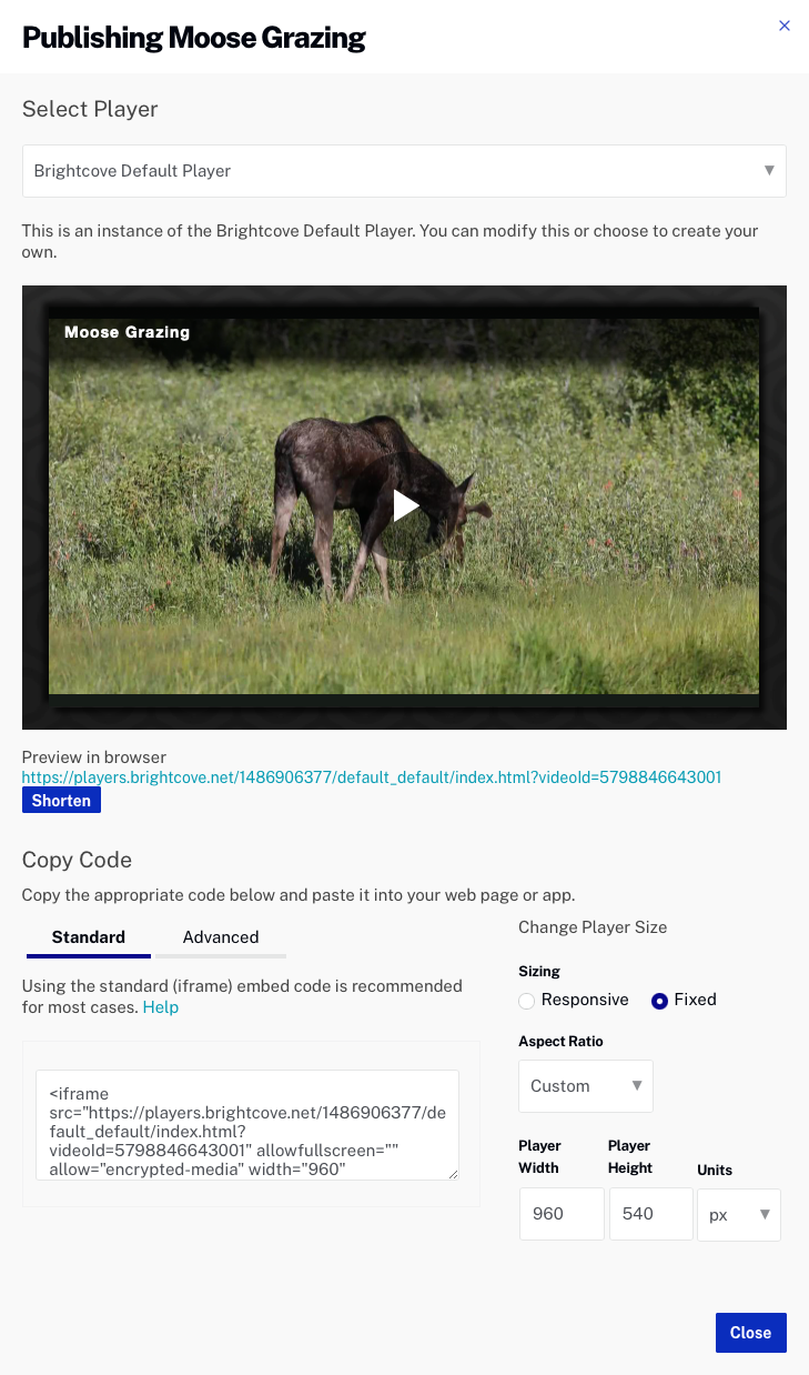 Media モジュールを使用して動画を公開する際、プレーヤー URL を使用して動画をプレビューしたり、iframe または Videoタグの埋め込みコードをコピーしてウェブページやアプリケーションに貼り付けることができます。