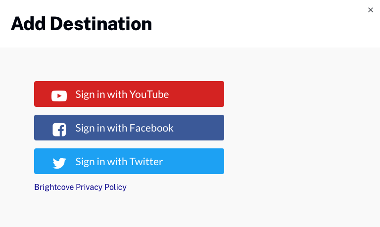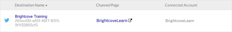 )は宛先名の横に表示されます。これは、ソーシャルメディアアカウントから Brightcove 権限が削除された場合、または送信先の作成時に使用した認証情報が無効になった場合に発生します。問題を解決するには、次の手順に従います。