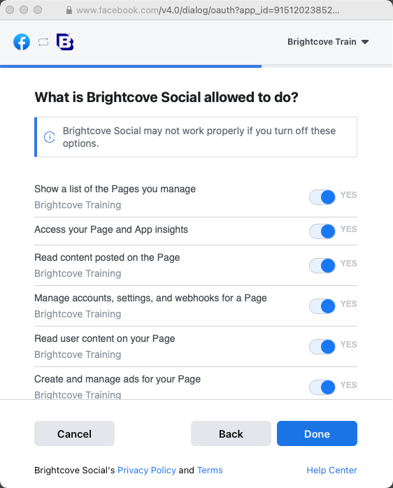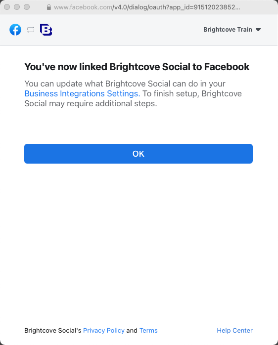 - ダイアログが開き、Brightcove Social がページを管理および公開し、ページとアプリのインサイトにアクセスすることが確認されます。[OK]をクリックします。