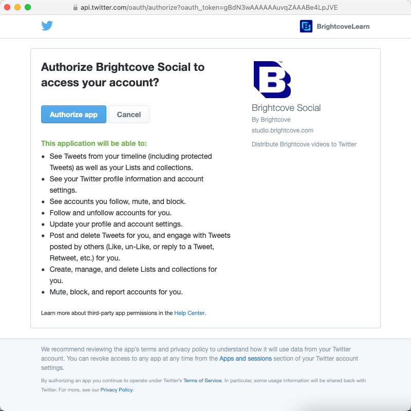 - Twitterアカウントにログインし、ブライトコーブソーシャルにアカウントの使用を許可するよう求められます。動画を投稿したいアカウントにログインします。ログインを求められない場合は、Twitterアカウントにログインしている可能性があります。続行する前に、正しいアカウントにログインしていることを確認してください。[ アプリの承認] をクリックします。