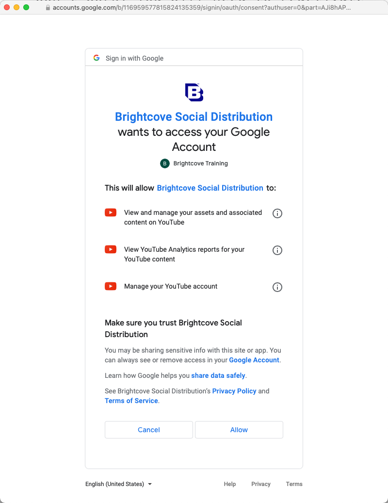 - YouTube アカウントを管理する権限を要求するダイアログが開きます。ダイアログの右上で、正しい Google アカウントを使用していることを確認します。そうでない場合は、ドロップダウンを使用して、動画を配信する Google アカウントを選択します。[許可]をクリックします。