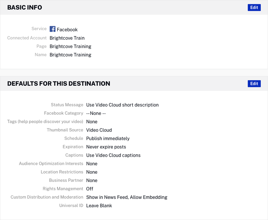 ソーシャルプラットフォームに動画を公開するときに、送信先のデフォルト値がデフォルトの動画プロパティとして使用されます。Facebook宛先の公開デフォルトを設定するには、宛先名をクリックし、「この宛先のデフォルト」セクションで「編集」をクリックします。以下の Facebook ビデオプロパティを設定できます。