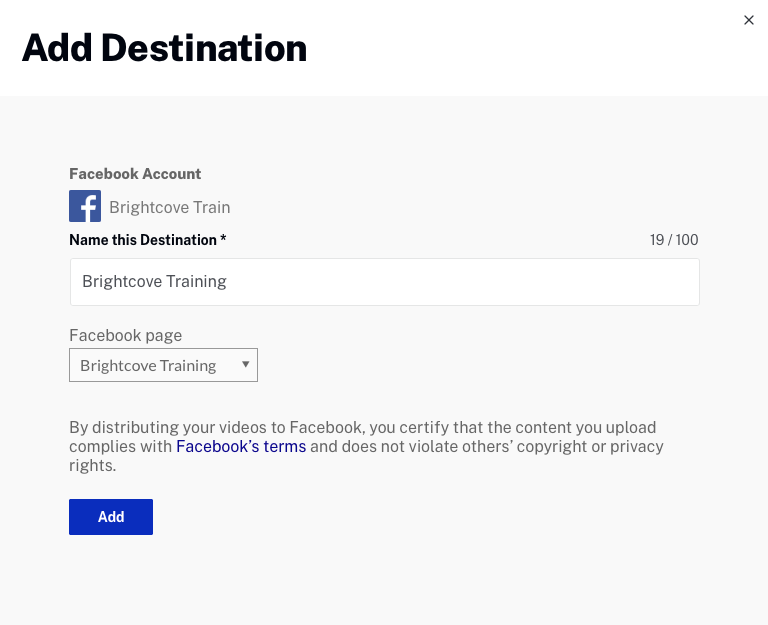Facebook ページにビデオを公開する場合は、Facebook の宛先を作成します。動画はFacebookページにのみ配信でき、個人のプロフィールページには配信できません。Facebook の宛先を作成するには、次の手順に従います。